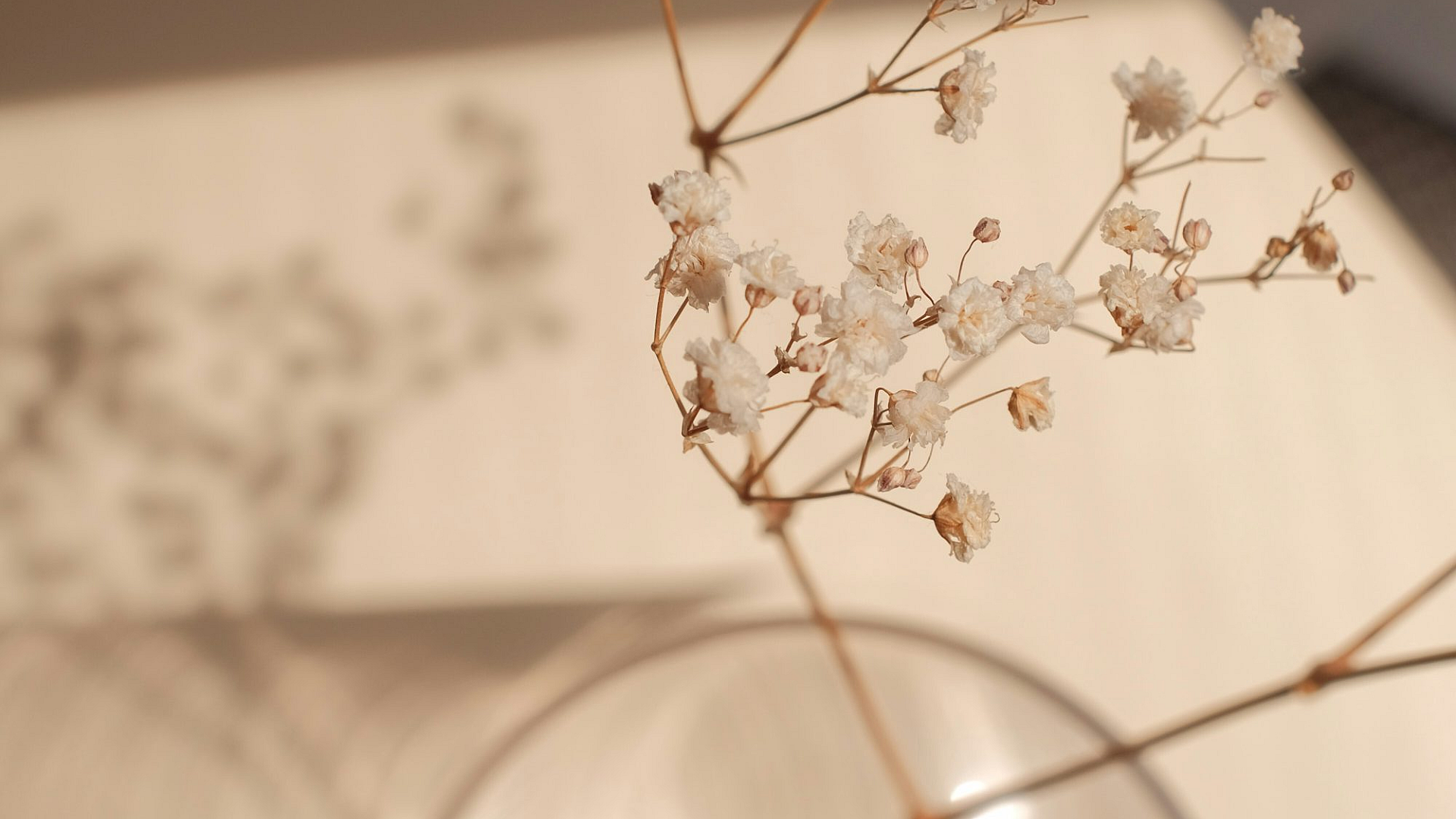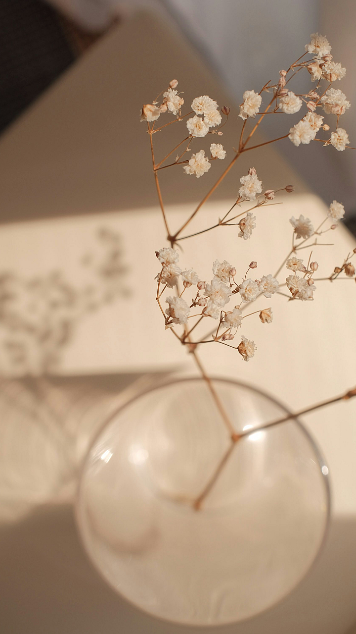 A serene image featuring a glass vase filled with delicate white flowers. This wallpaper offers a minimalist yet elegant aesthetic, perfect for a peaceful and calming atmosphere.