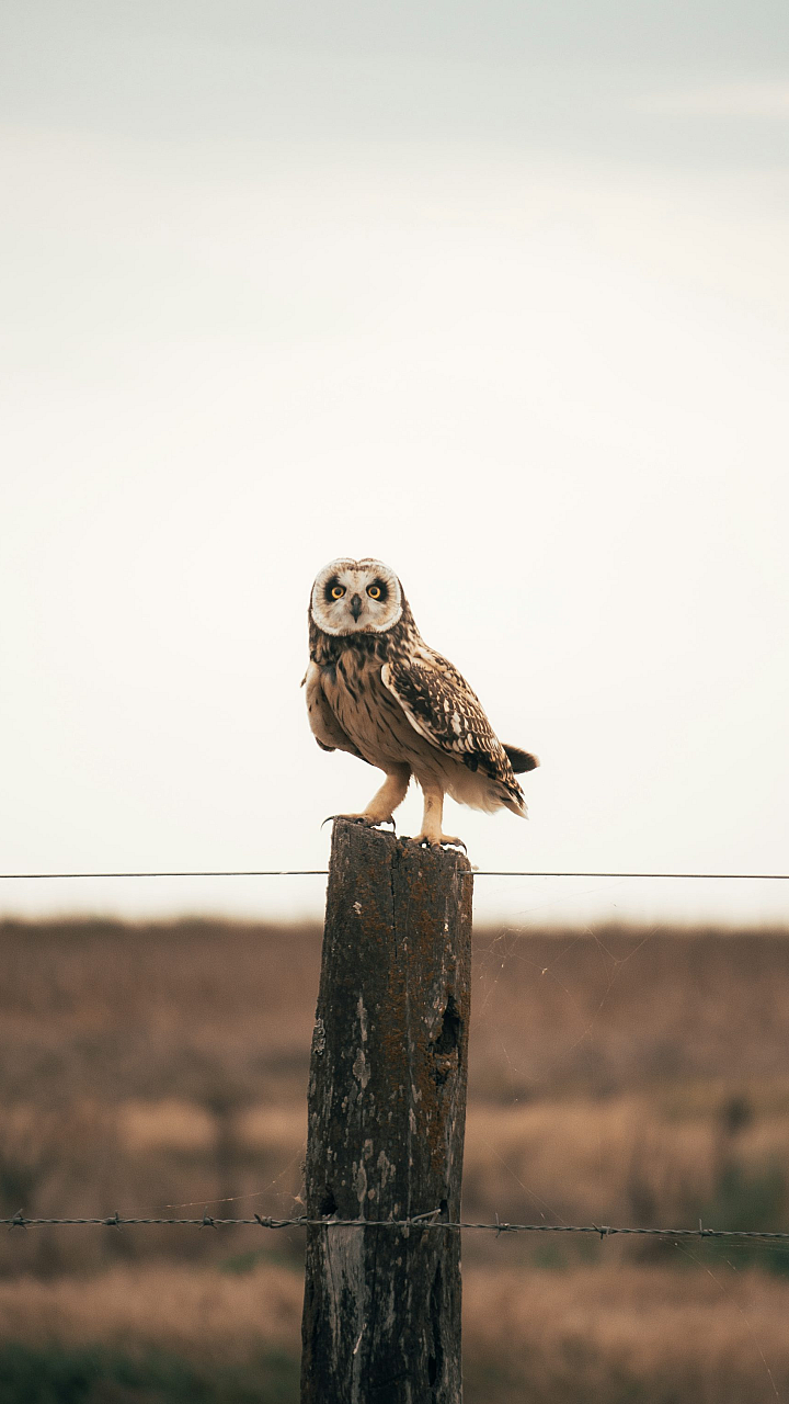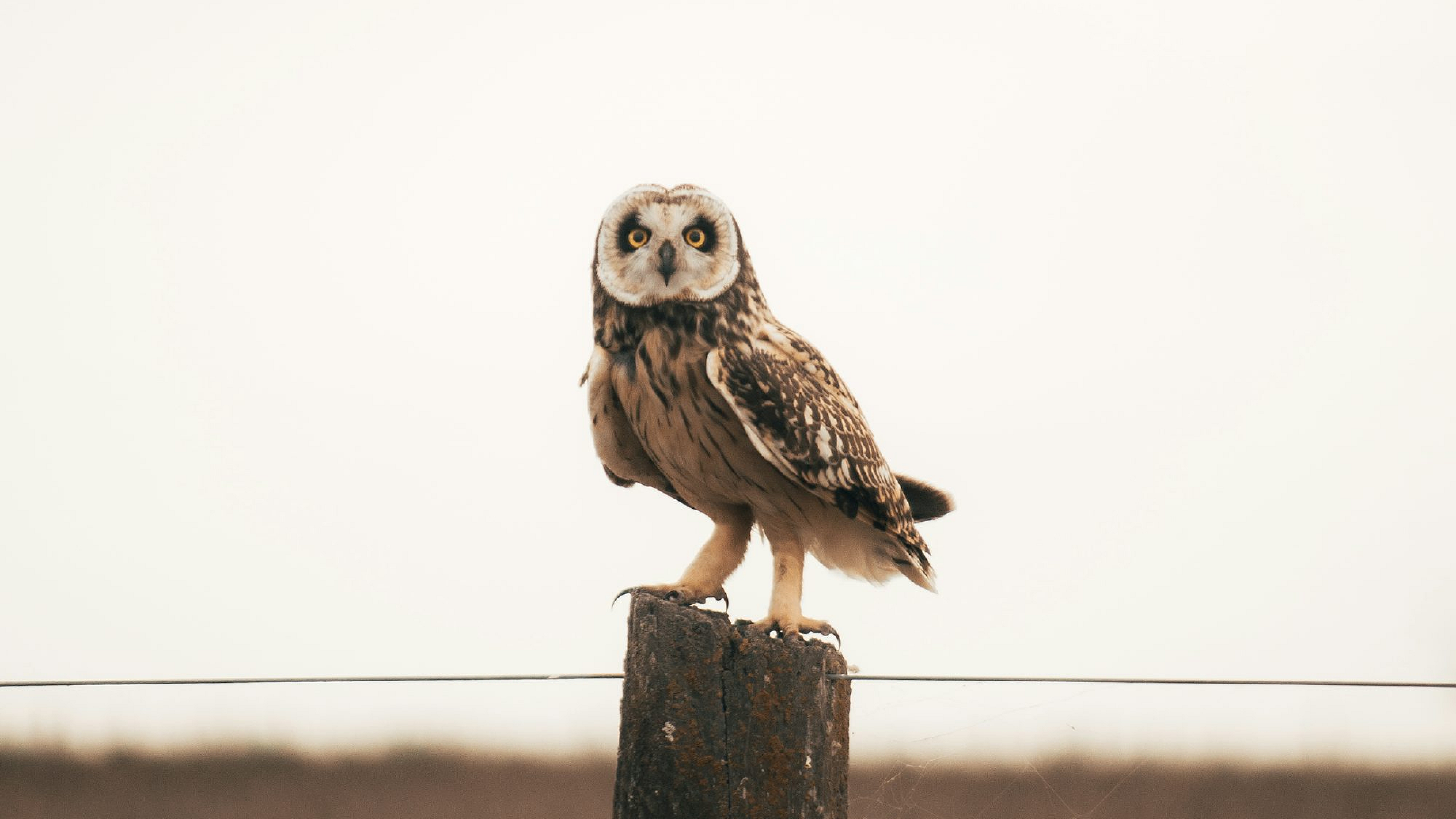 A serene image of a wise owl perched atop a rustic wooden post. Perfect for a peaceful desktop background.