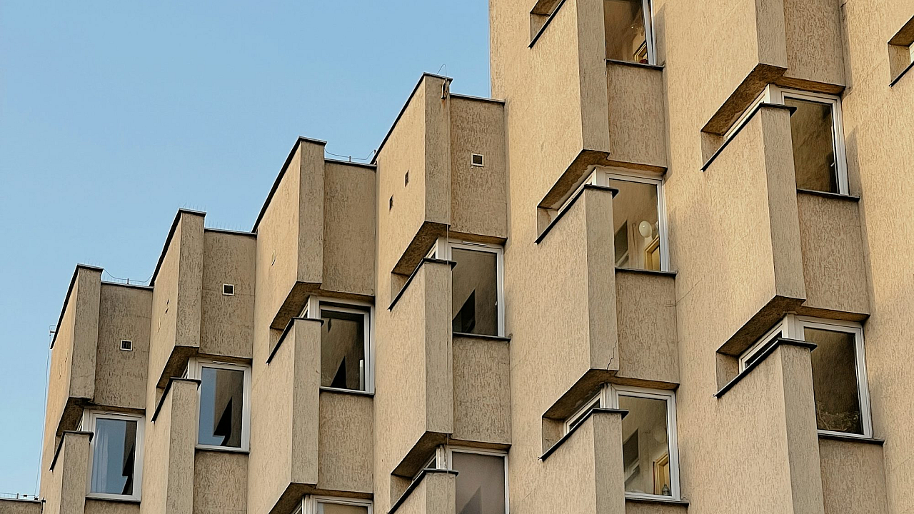 This wallpaper features a minimalist image of a beige concrete building bathed in daytime sunlight. Perfect for a clean, modern aesthetic.