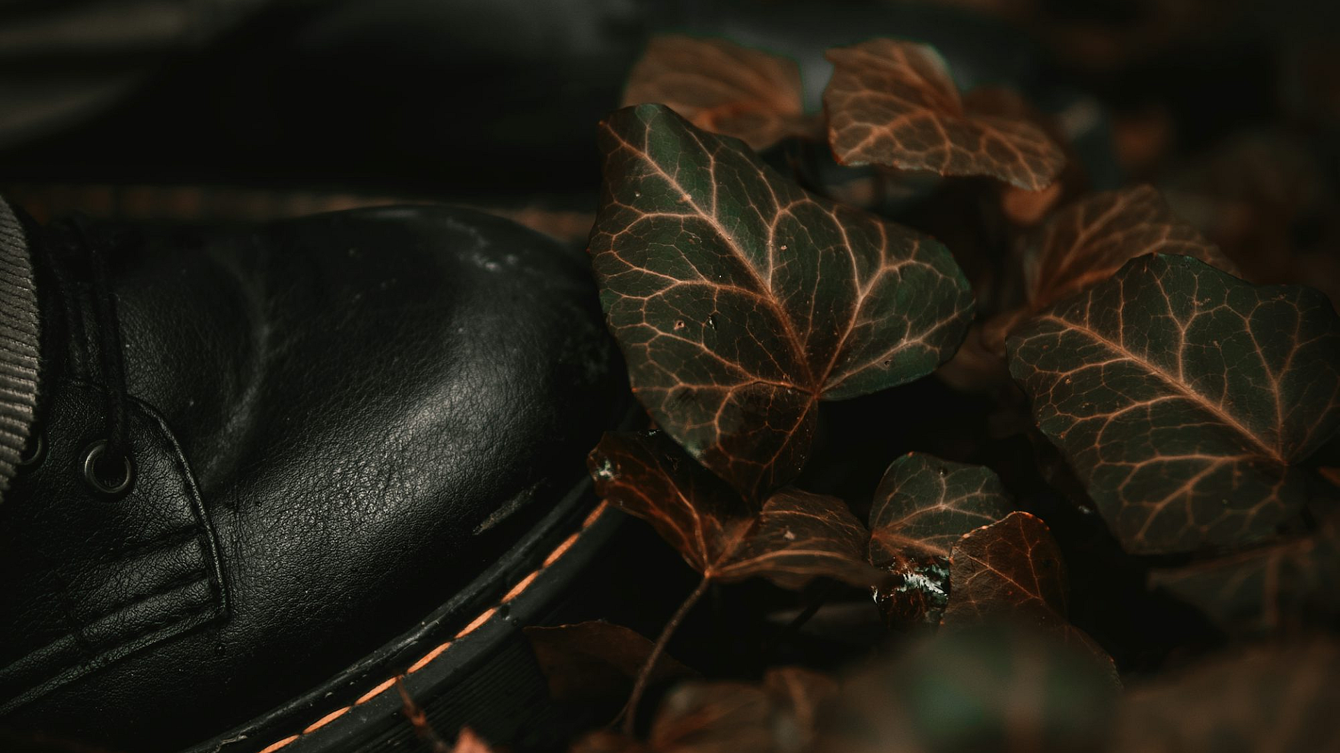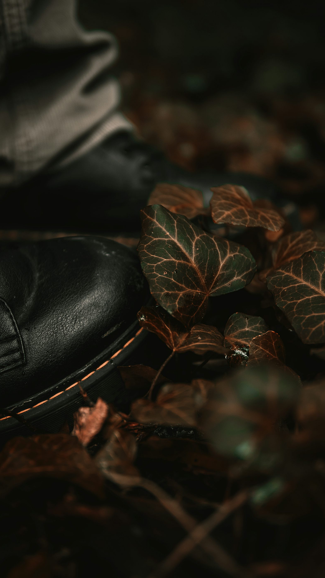 A stunning wallpaper featuring a black leather shoe resting amongst a bed of brown autumn leaves. Provides a textured and moody aesthetic.