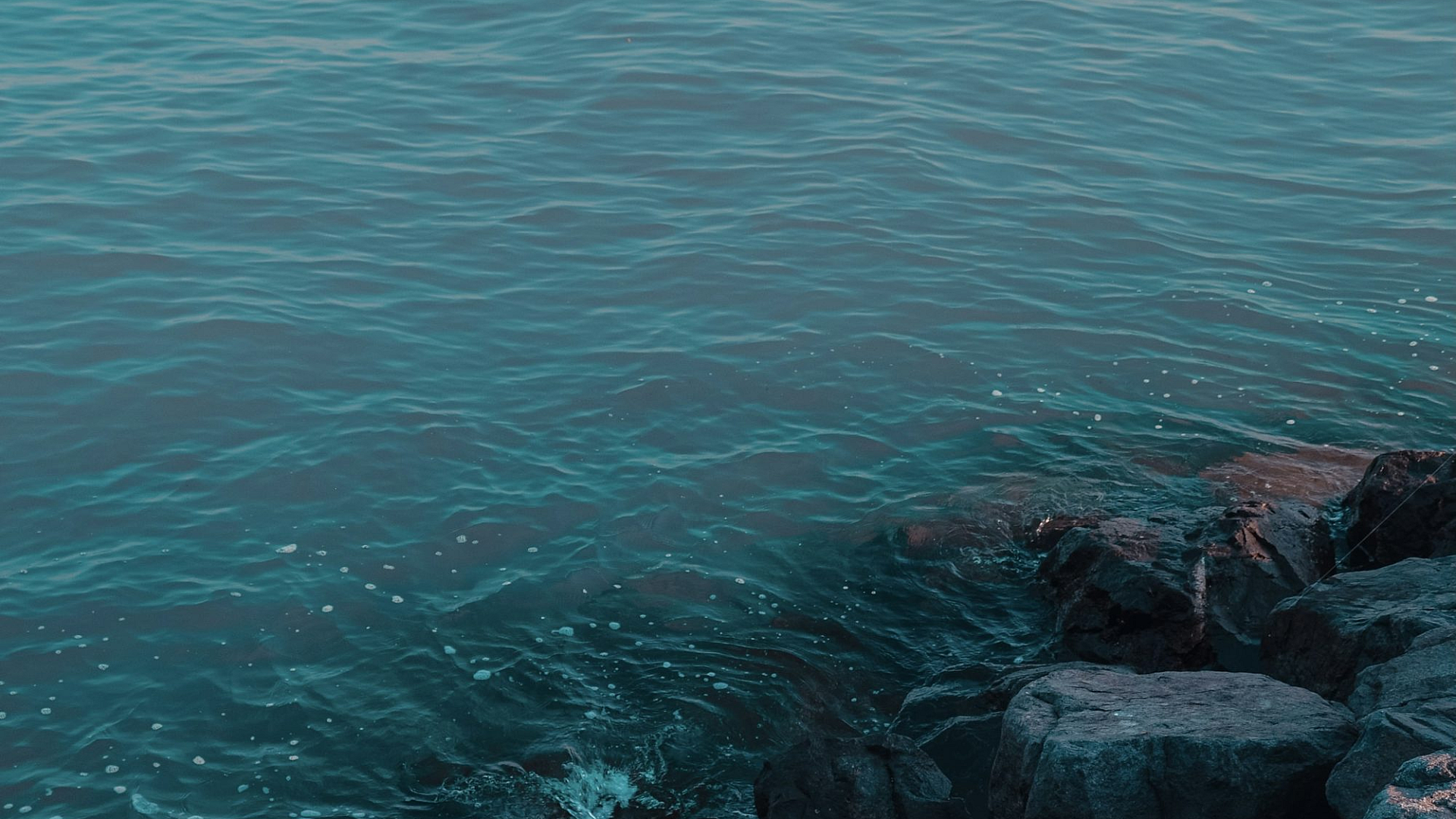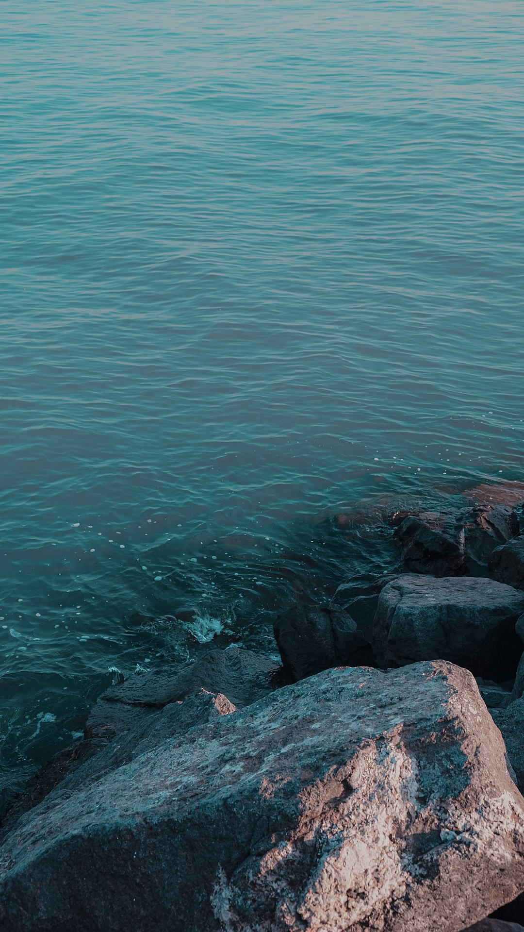 A stunning wallpaper featuring a gray, rocky shore bathed in the daytime sun. The scene evokes a sense of serenity and natural beauty.