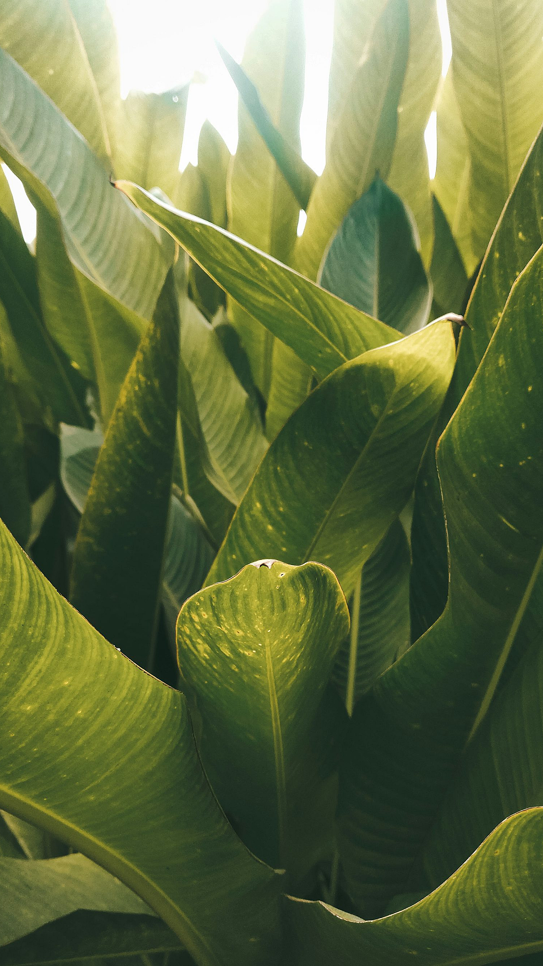 A vibrant wallpaper featuring lush green banana leaves bathed in the sunlight of a bright daytime scene. Perfect for a tropical-themed aesthetic.