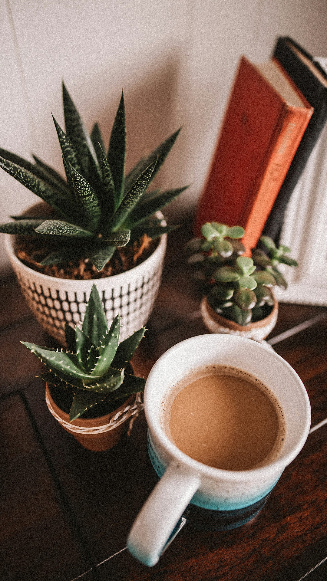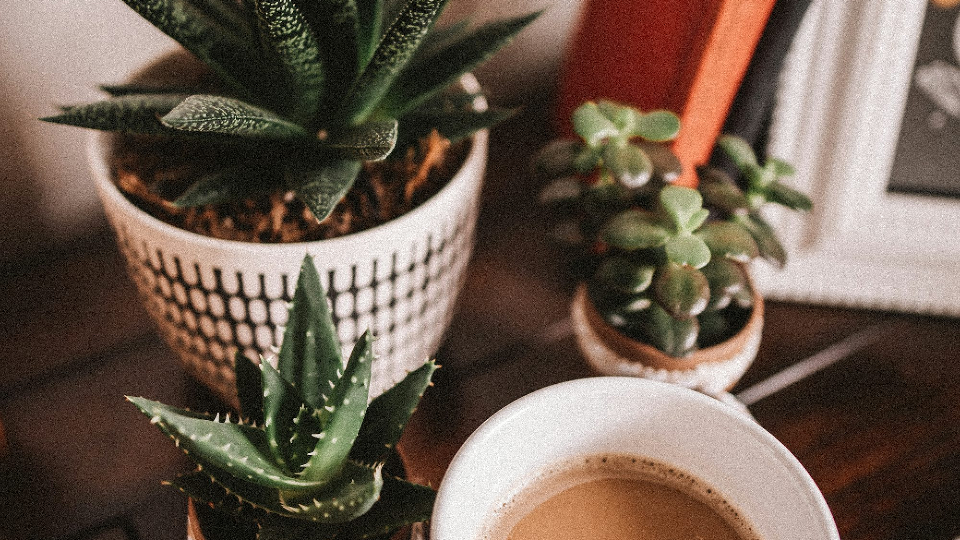 A refreshing minimalist wallpaper featuring a green cactus plant subtly placed on a white ceramic mug. Perfect for a clean, nature-inspired desktop or phone background.