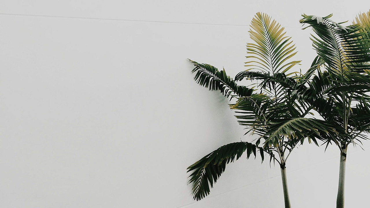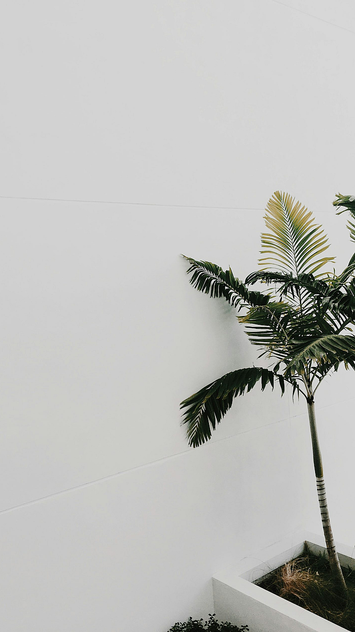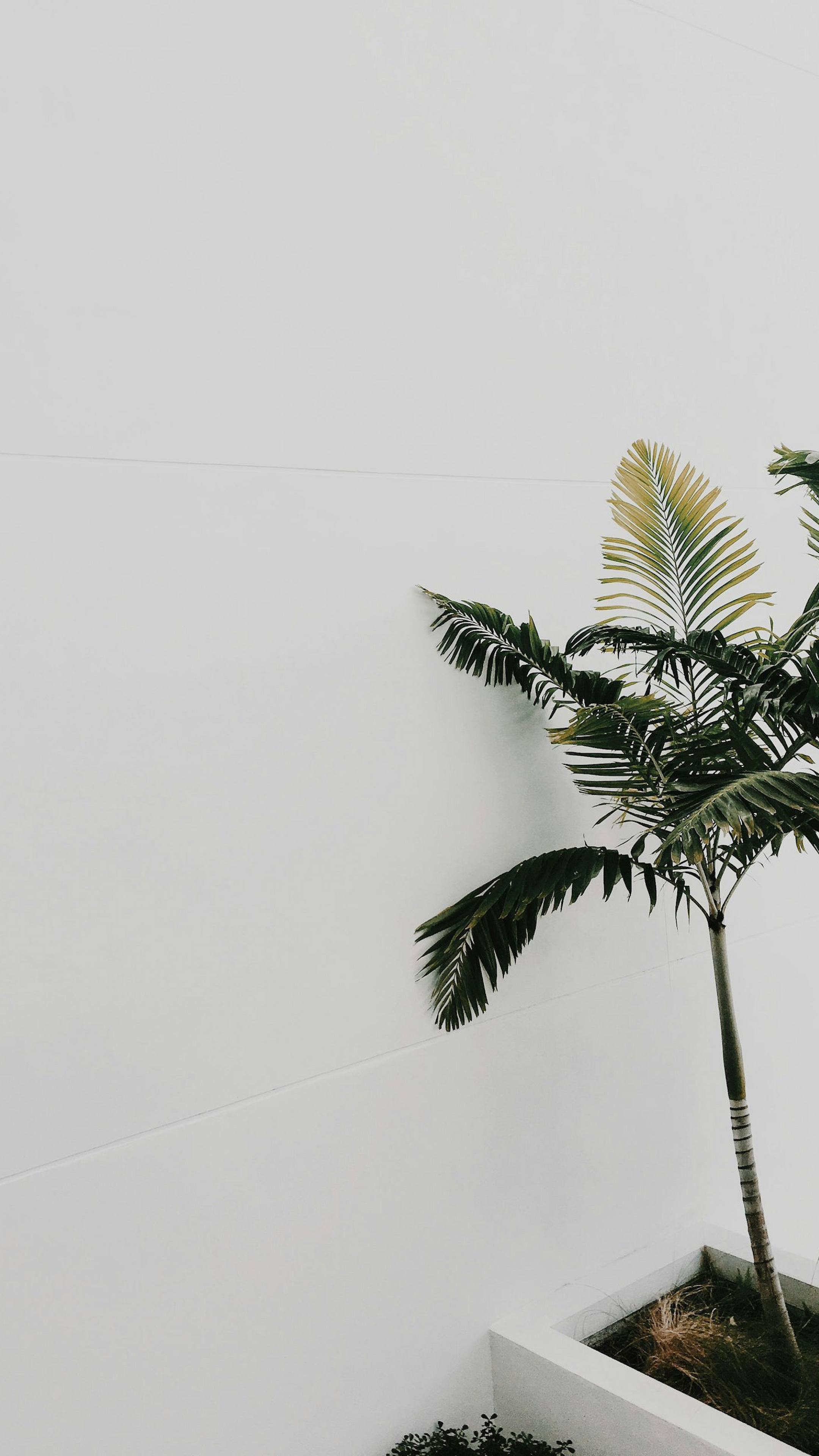 green palm tree, white wall, tropical, nature, wallpaper, minimalism, plant, background, simple, aesthetic