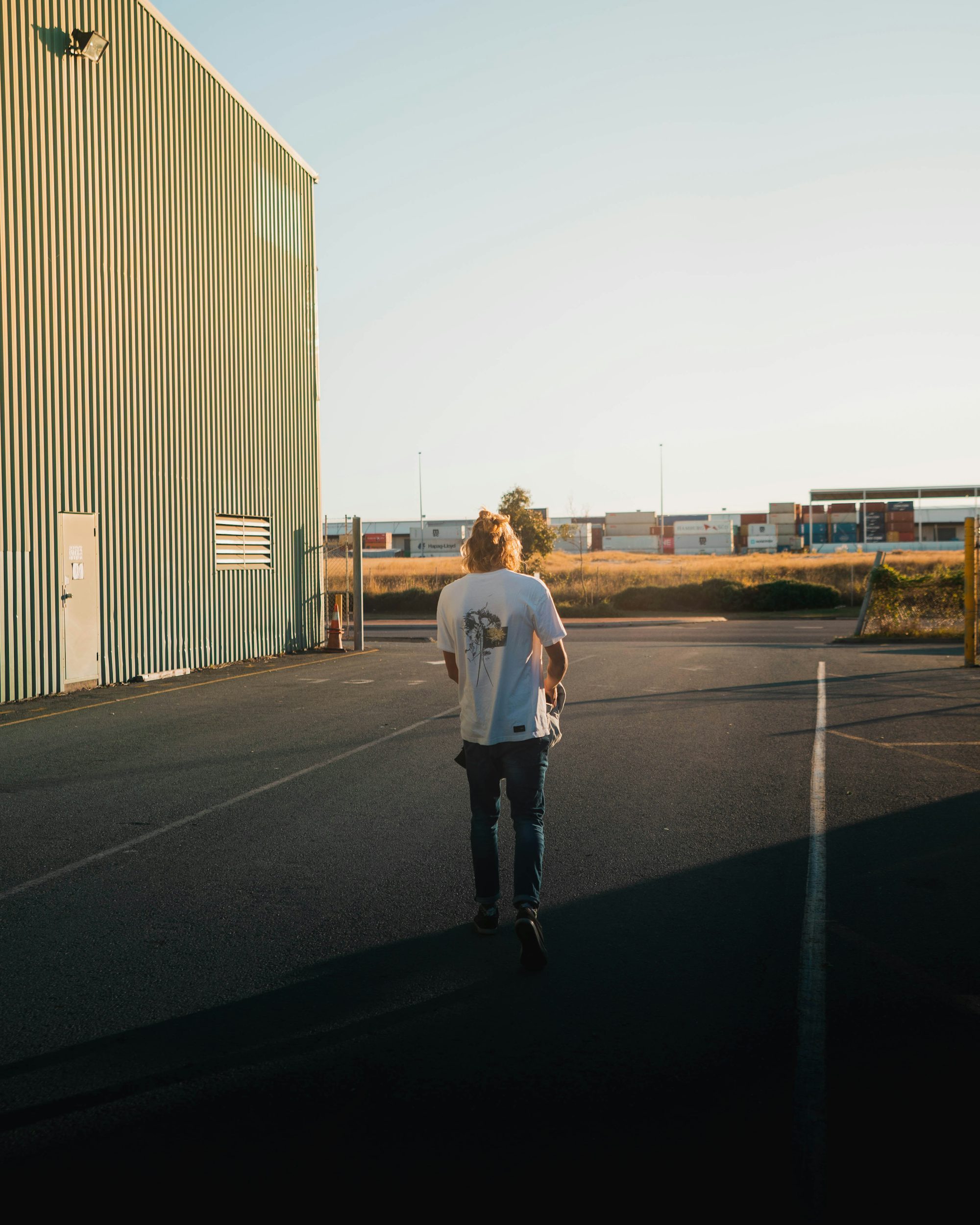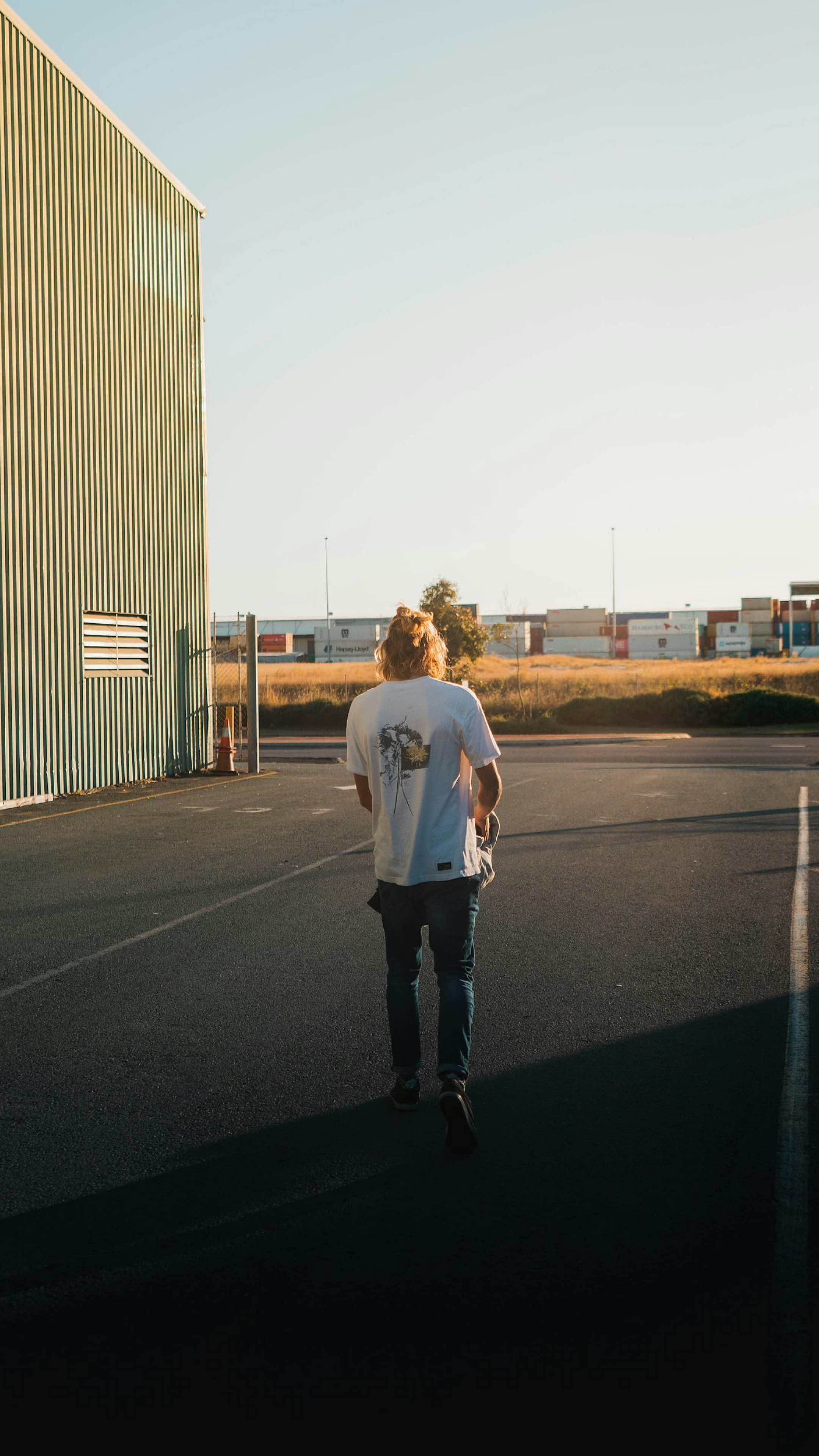 A crisp image of a man in a white dress shirt and black pants strolling down a gray asphalt road on a sunny day. Provides a clean, minimalist aesthetic.