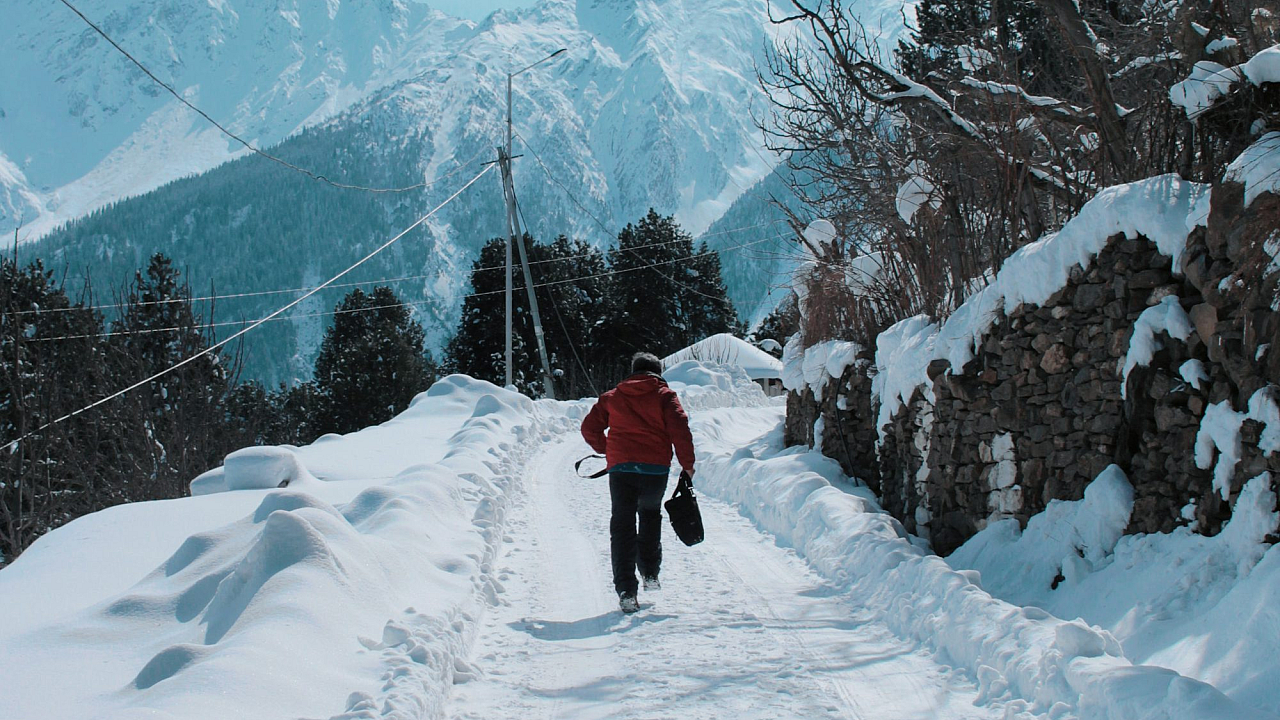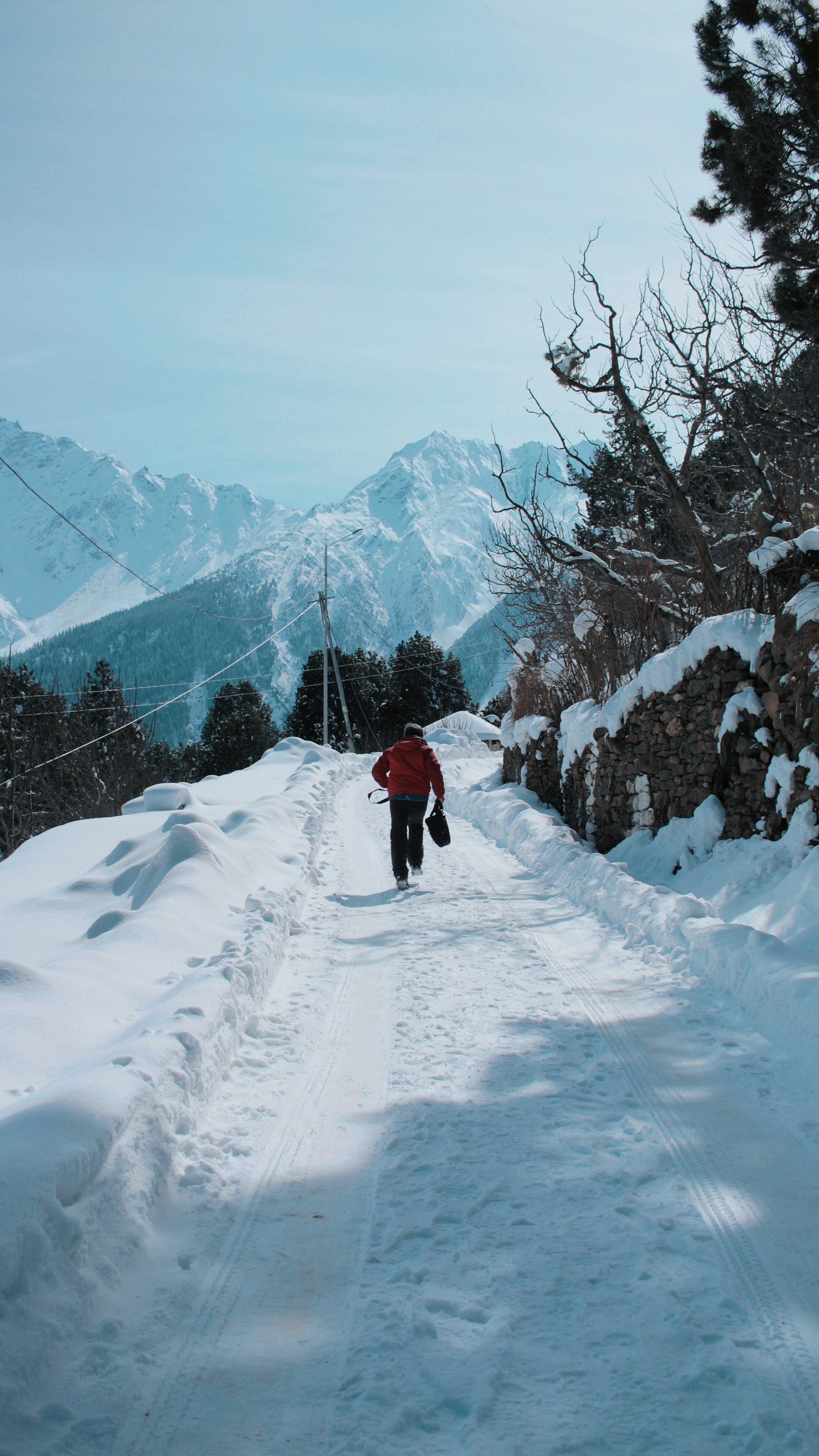 A serene winter scene depicting a lone figure walking through a pristine, snow-covered landscape. Perfect for a calming desktop background.