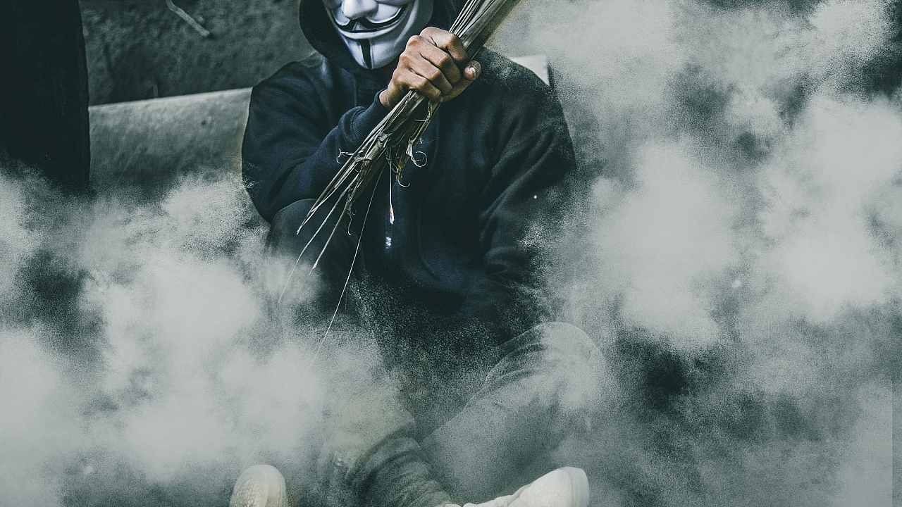 A mysterious figure, shrouded in darkness, holds a burning torch while wearing a Guy Fawkes mask. A powerful image perfect for a desktop background.