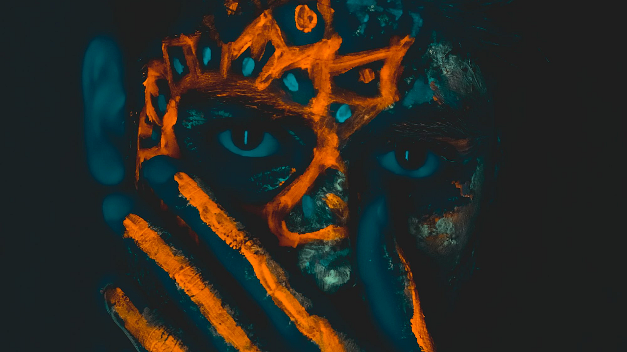 This wallpaper features a striking portrait of a person with intricate face tattoos. The image is high-resolution and perfect for a desktop or mobile background.