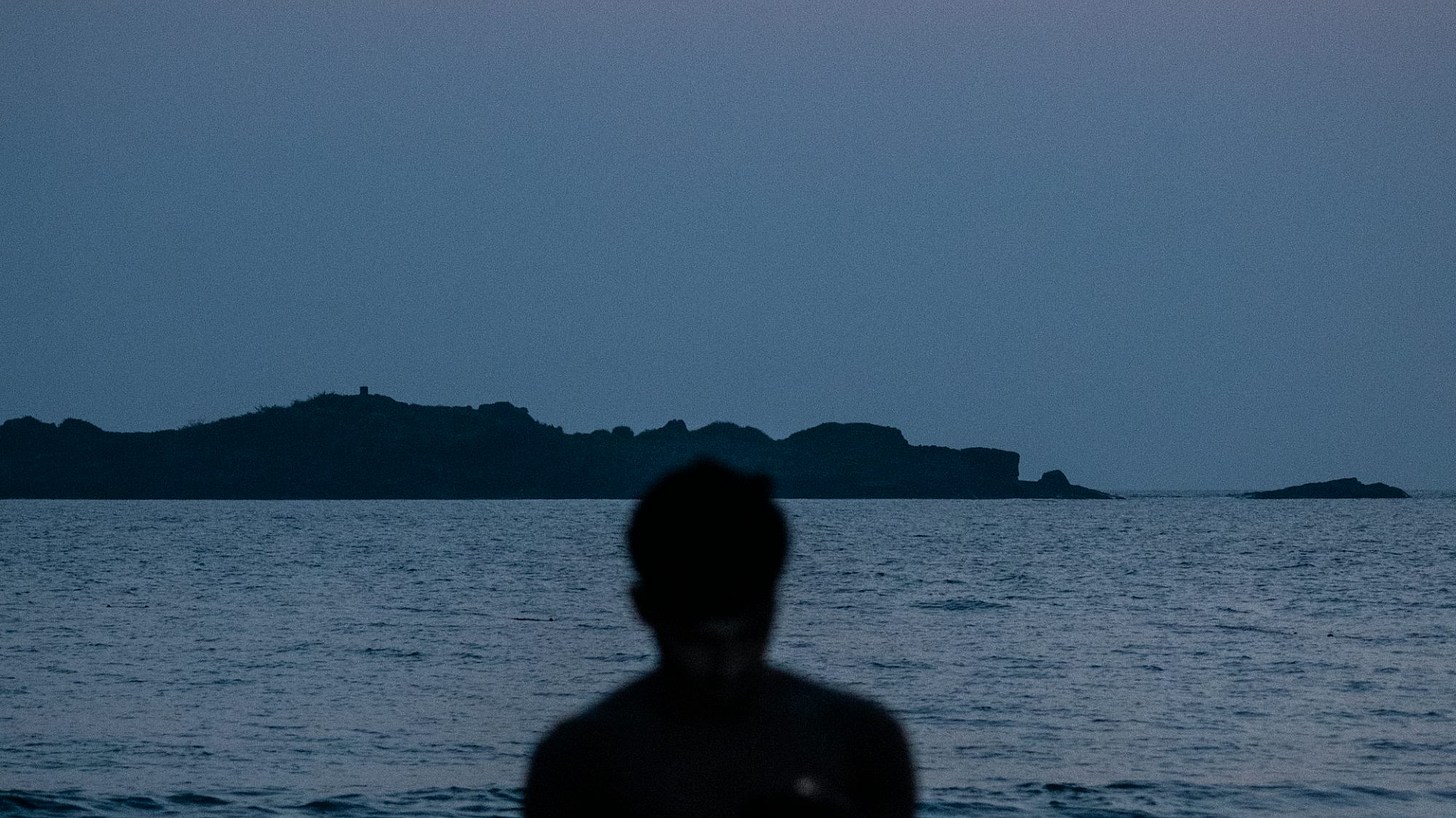 A striking silhouette of a man standing on the seashore, bathed in the warm light of day. A minimalist and evocative image perfect for your desktop.