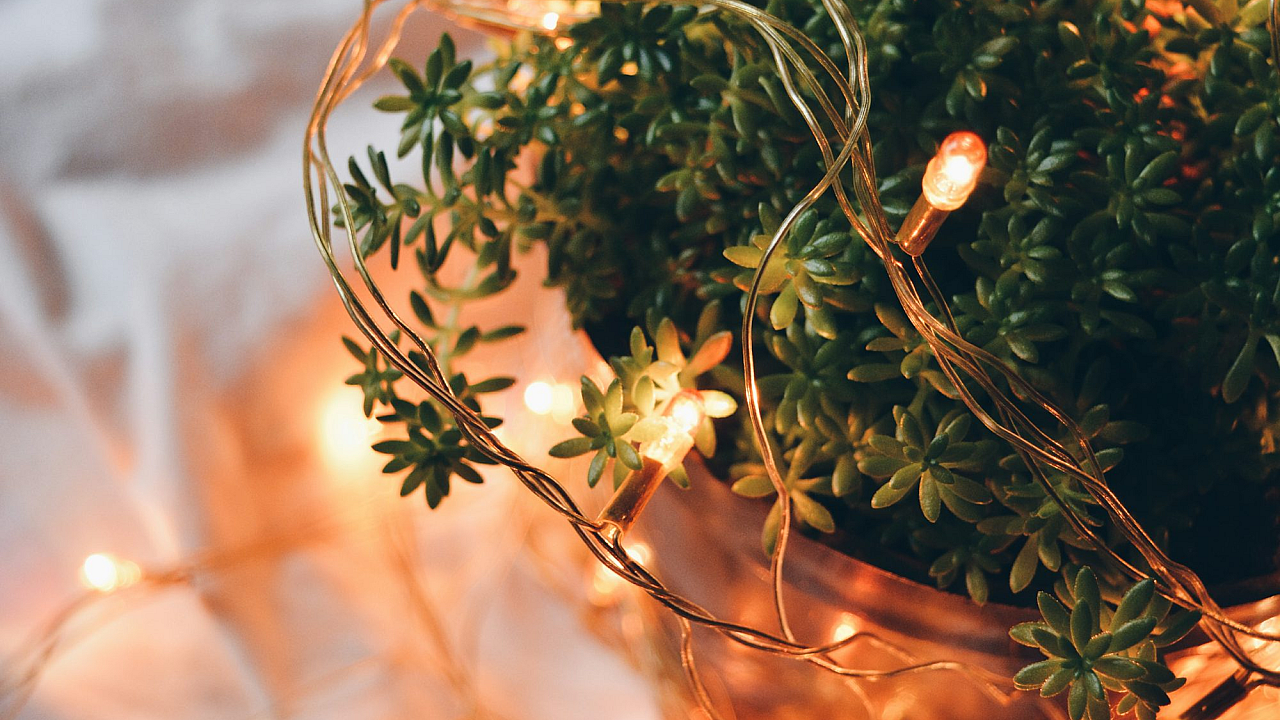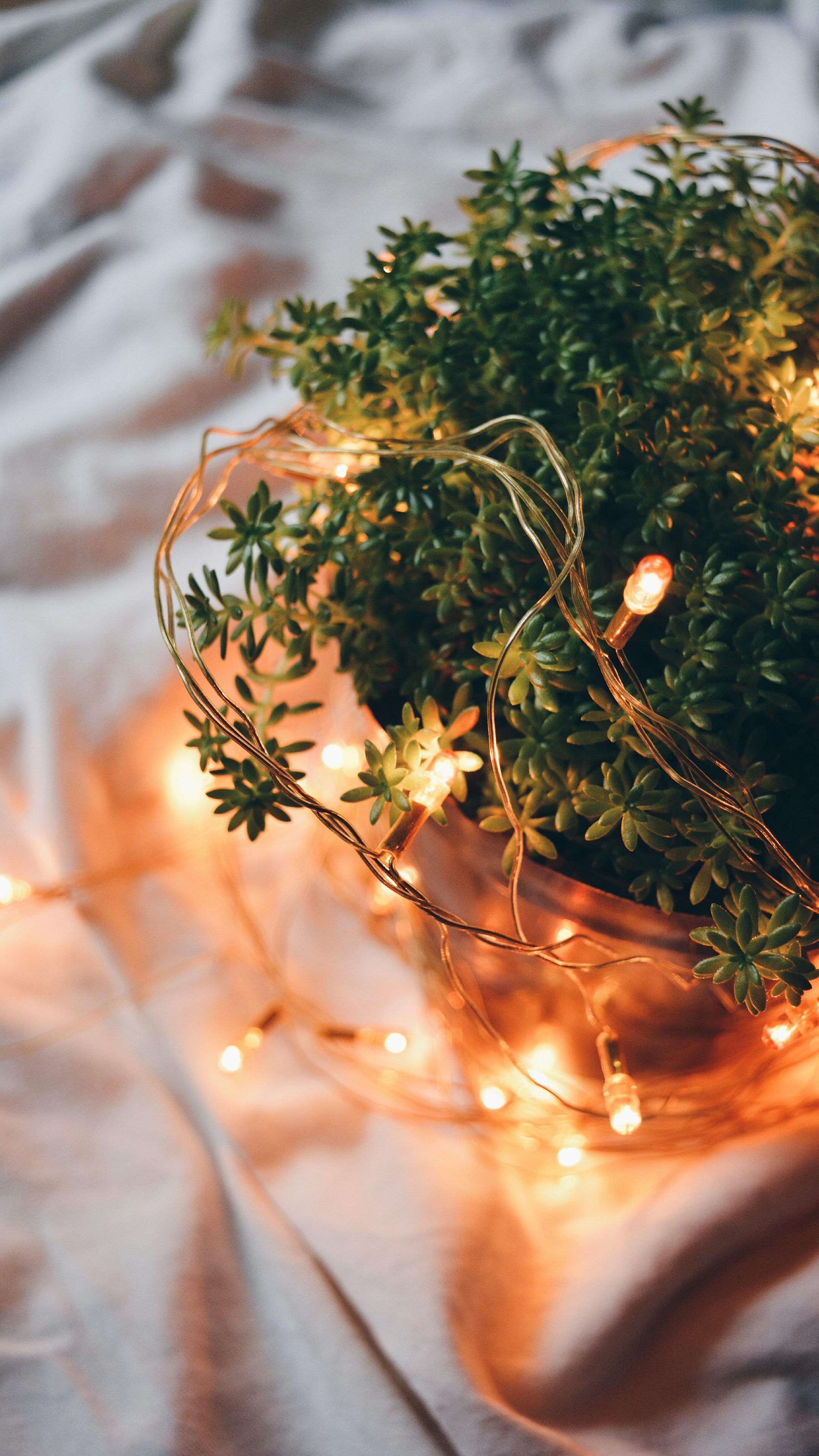tilt shift, string lights, orange lights, green plant, photography, wallpaper, miniature effect, night photography, warm lighting, plant photography