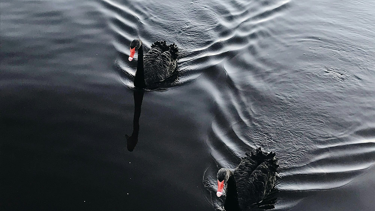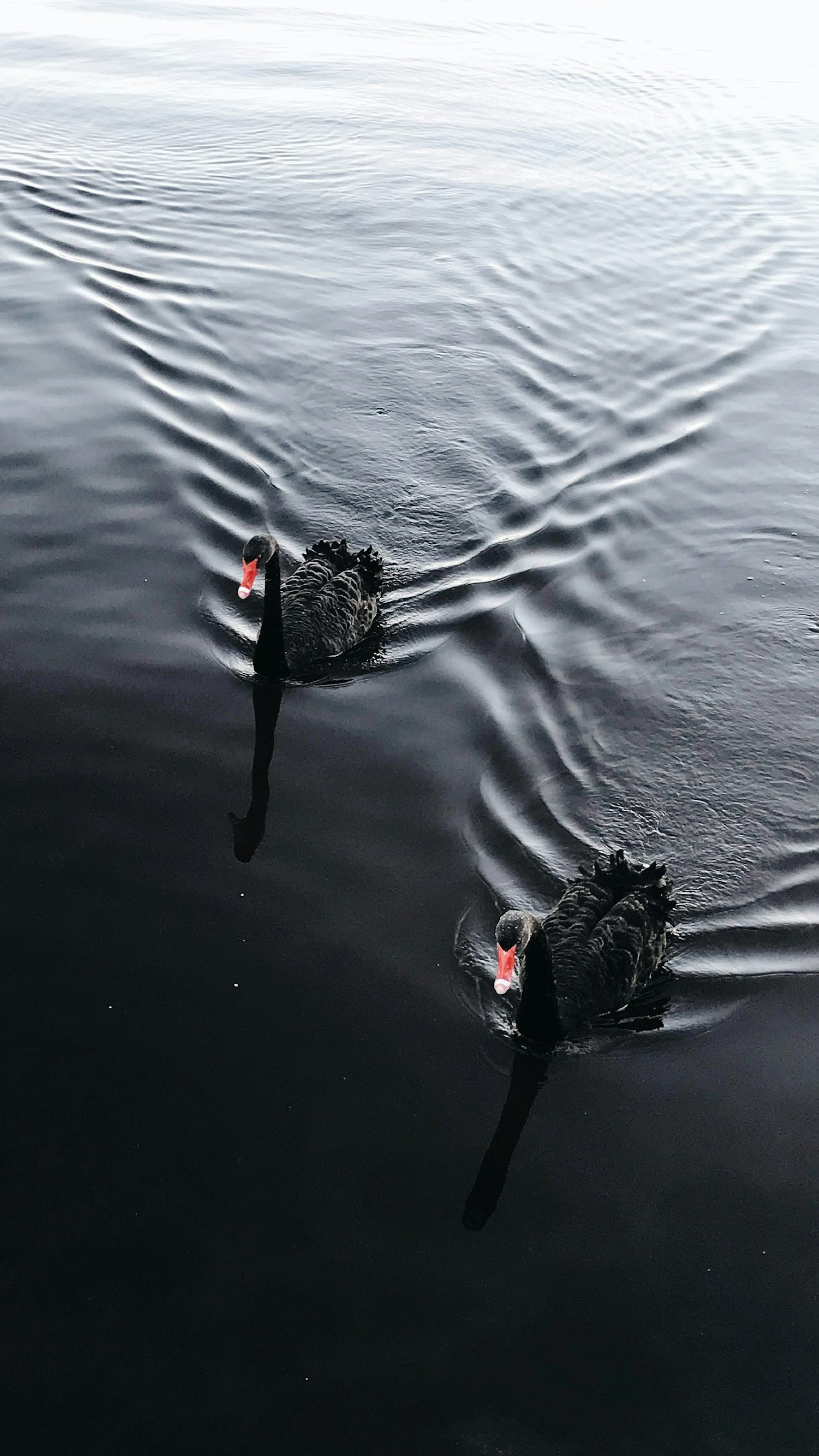 This wallpaper features two elegant black ducks gracefully floating on calm water. A serene and peaceful scene perfect for your desktop or mobile device.