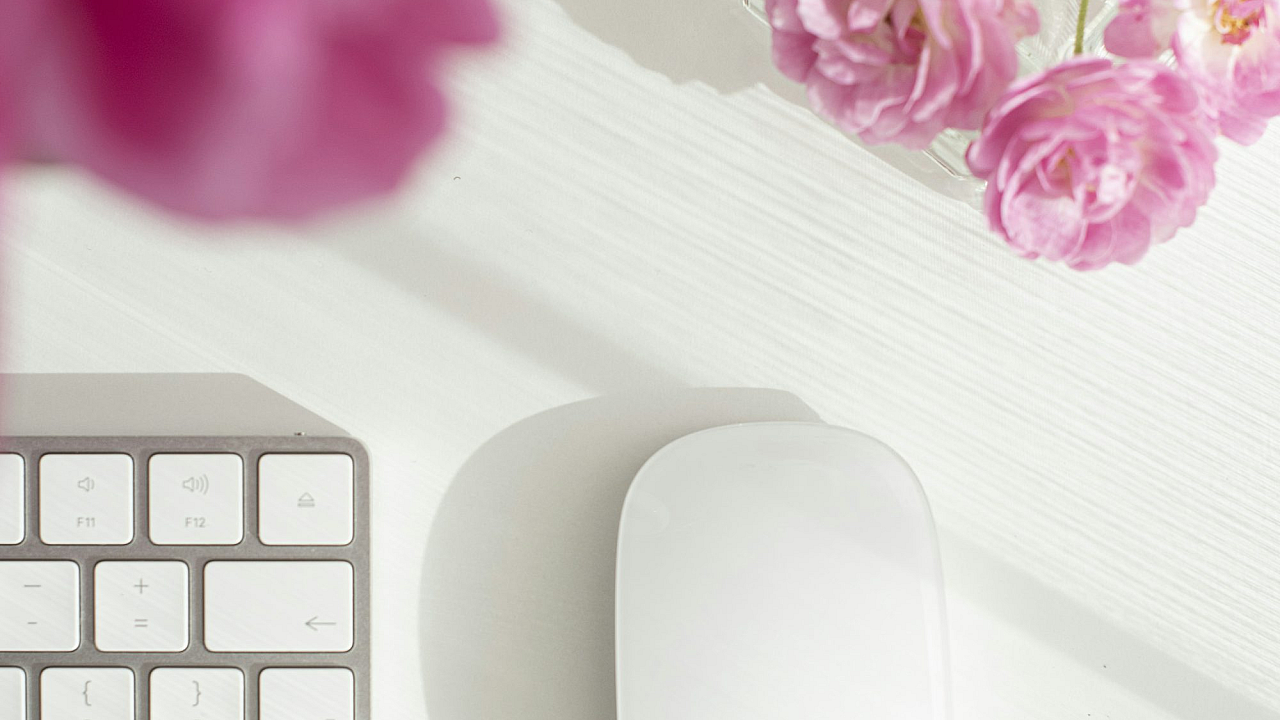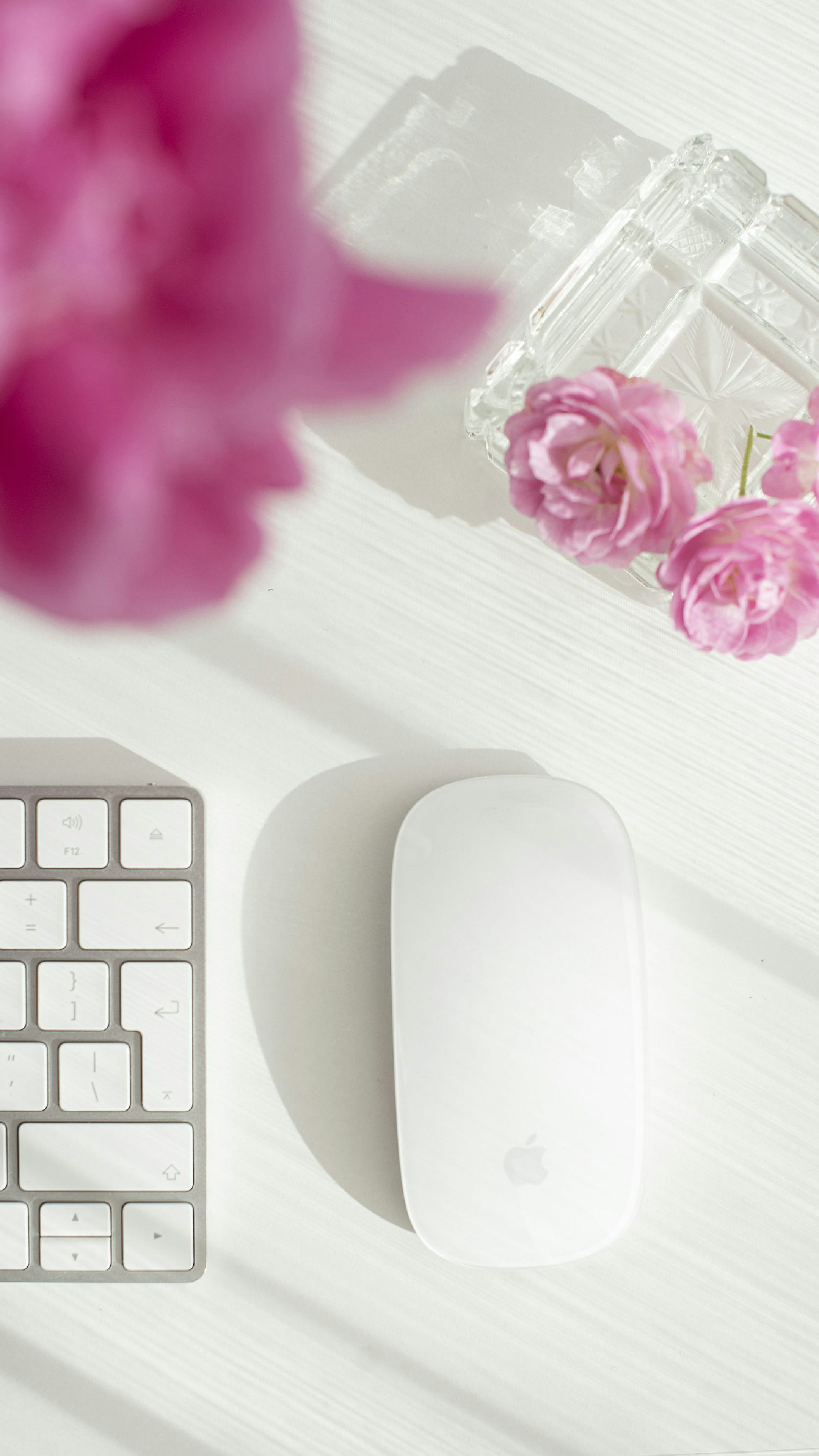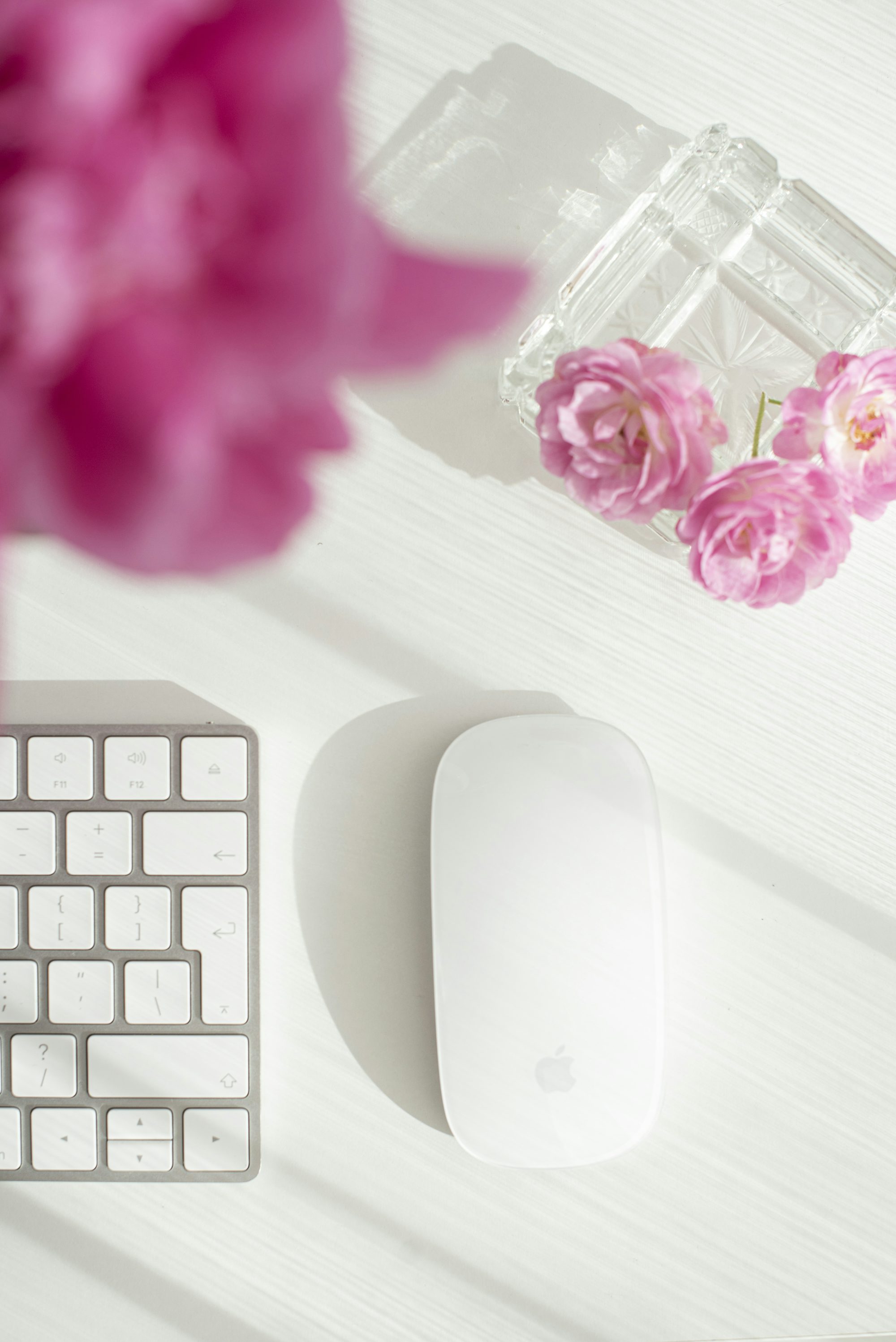 white apple magic mouse, pink flower, white wooden table, minimalist, wallpaper, desktop background, clean aesthetic, technology, nature, simple