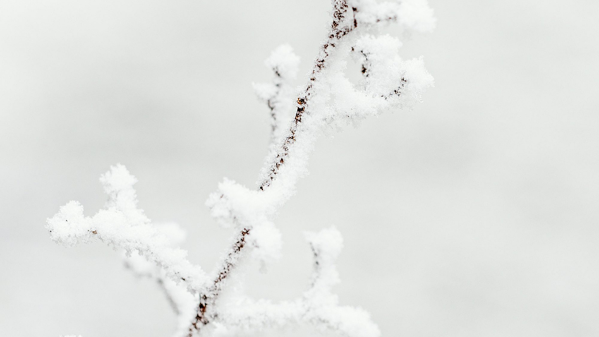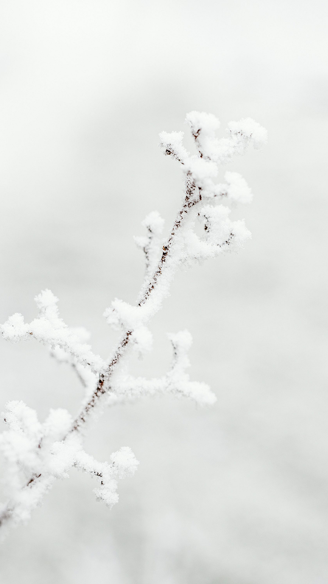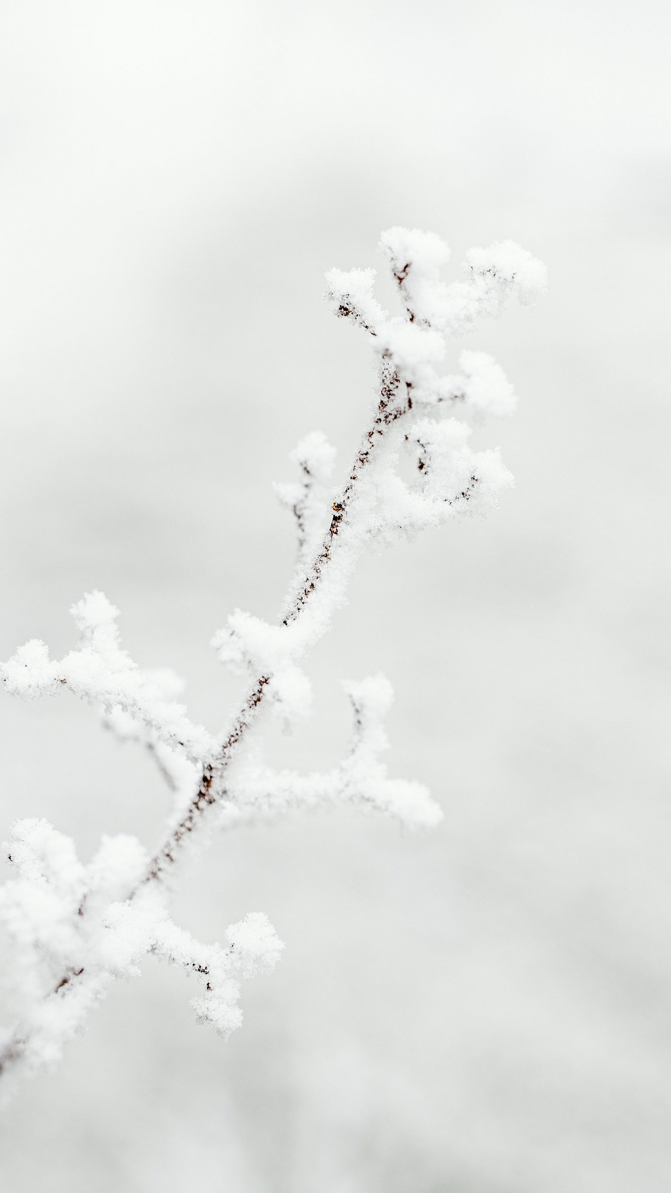 A minimalist winter scene featuring a stark contrast: white snow delicately clinging to a black tree branch. Perfect for a calming, serene desktop background.
