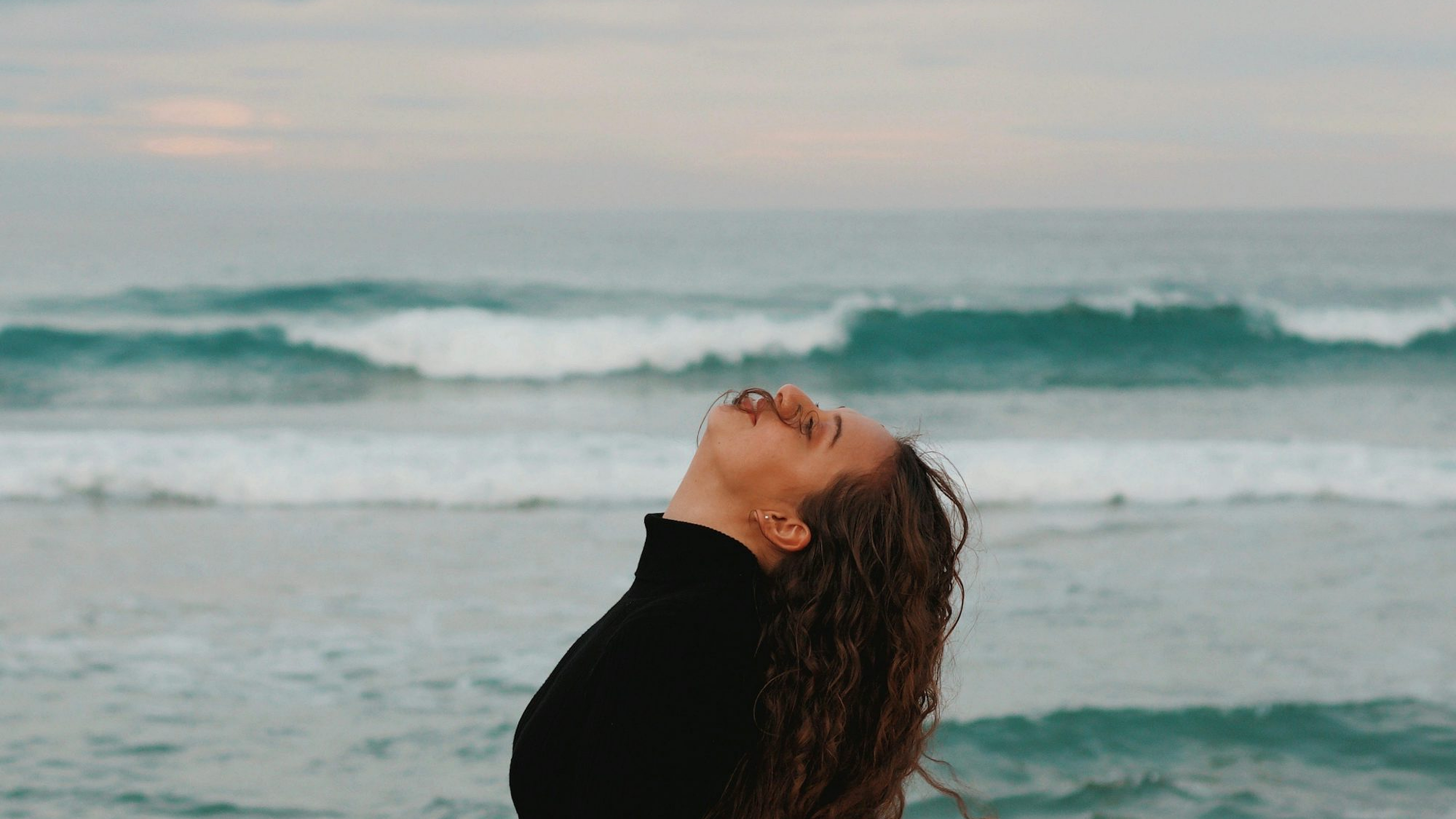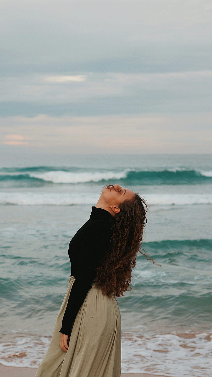 woman, seashore, black shirt, long sleeve, daytime, ocean, beach, standing, wallpaper, portrait
