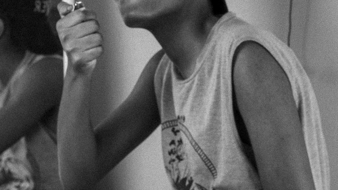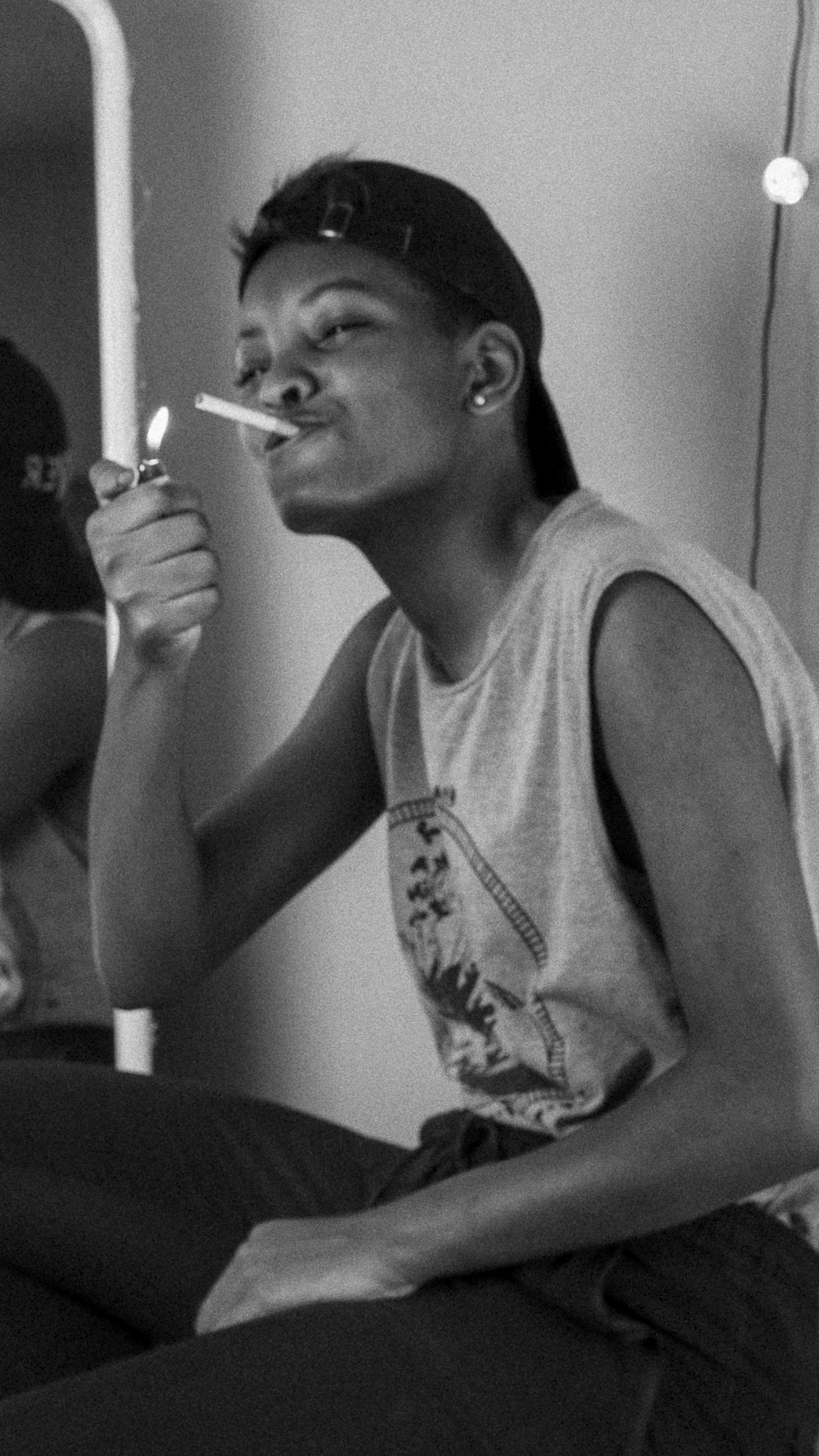 A captivating wallpaper featuring a woman in a tank top, exhaling a cigarette. Moody and stylish, perfect for a desktop or mobile background.